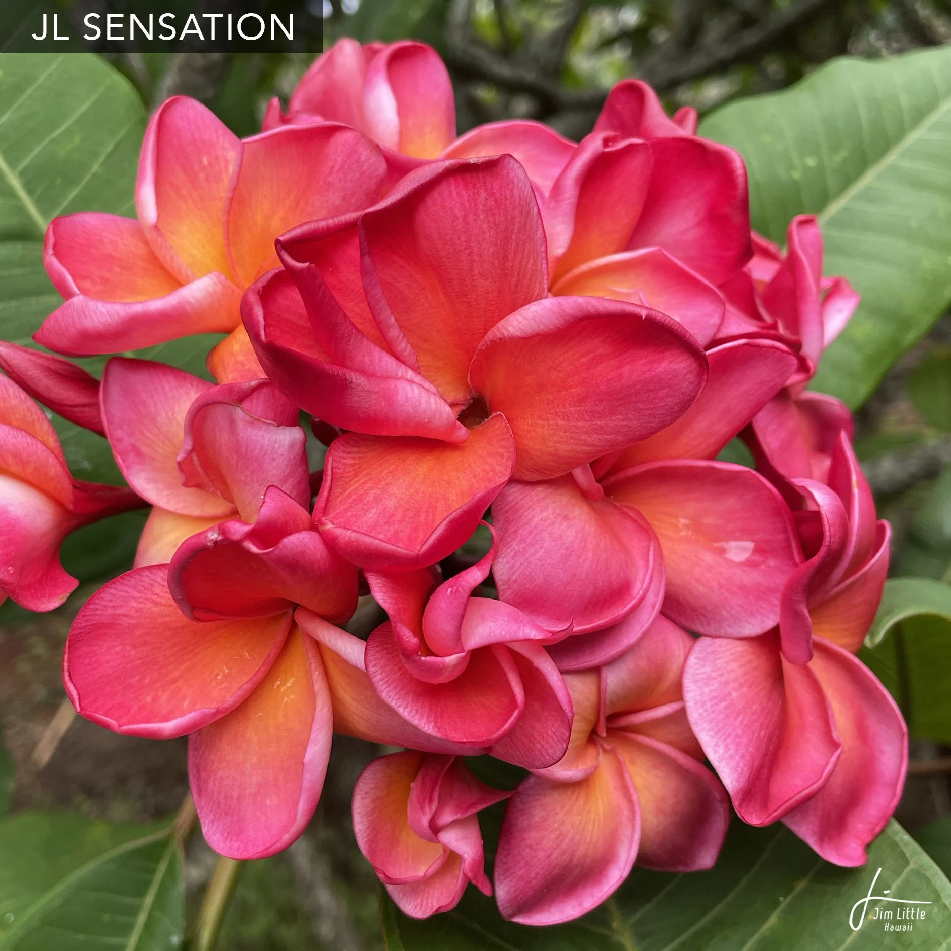 JL Waimea---$50---Waimea plumeria cutting has a vibrant burst of red, orange and pink. It has a fruity sweet fragrance and can be used to make leis. Waimea has a well proportioned growth habit which looked good in landscaping.