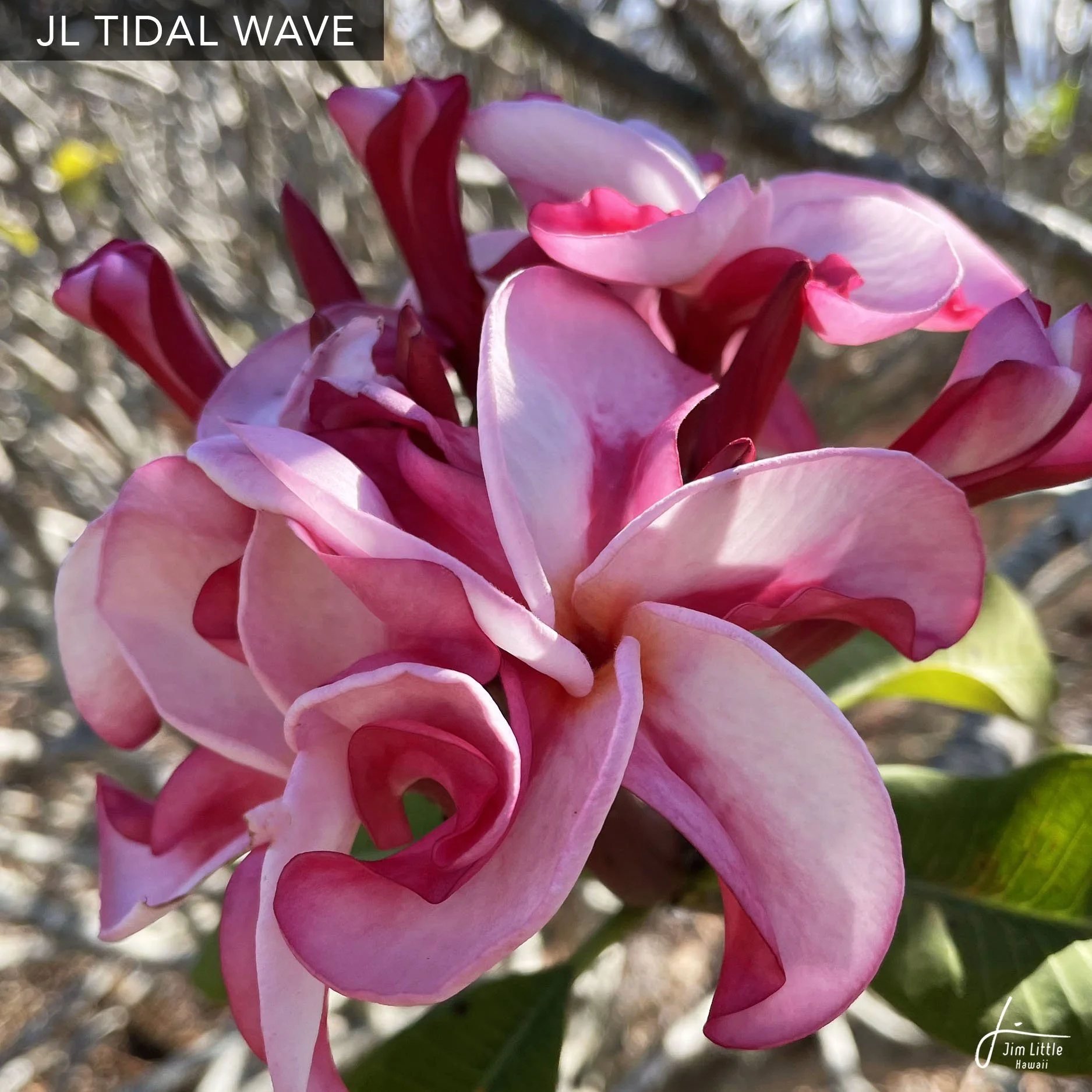 JL Brock's Wave---$300---This amazing plumeria was named after Jim Little’s son Brock. The flower averages 4-5 inches with a sweet fragrance. It has a yellow orange center that flows to a bright white, with beautiful pink edging.